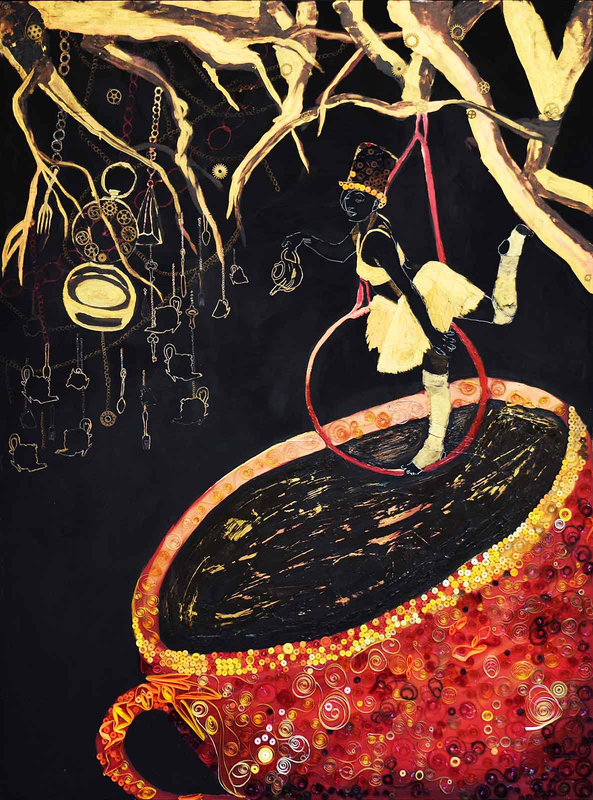 Medium: Acrylic, bronze, quilling paper, colored pencil on wood