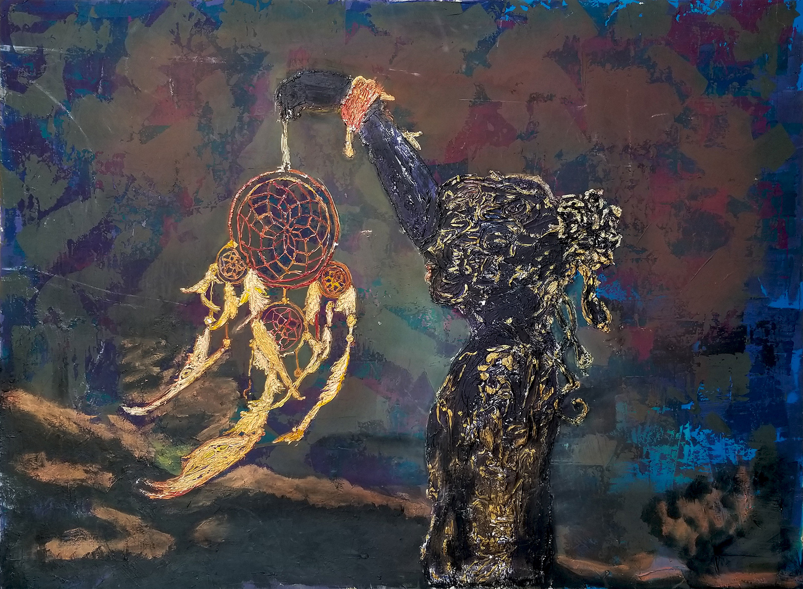 Medium: Acrylic, bronze, quilling paper, colored pencil on wood